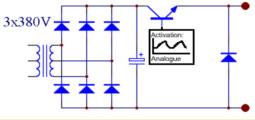 圖2為模擬式焊機(jī)的主電路框圖。這種電源由一個(gè)工頻變壓器、三相整流橋和一個(gè)晶體管組組成,晶體管組在回路中的作用相當(dāng)于負(fù)載的串聯(lián)電阻。晶體管組工作在放大區(qū),焊接中不需要的電壓消耗在晶體管組的#p#分頁標(biāo)題#e#C、E極之間,因此功耗極大,晶體管組需要水冷。這種焊機(jī)的優(yōu)點(diǎn)是響應(yīng)速度快,缺點(diǎn)是晶體管組的能耗大,因此基本上已經(jīng)被其它類型的電源所取代。
