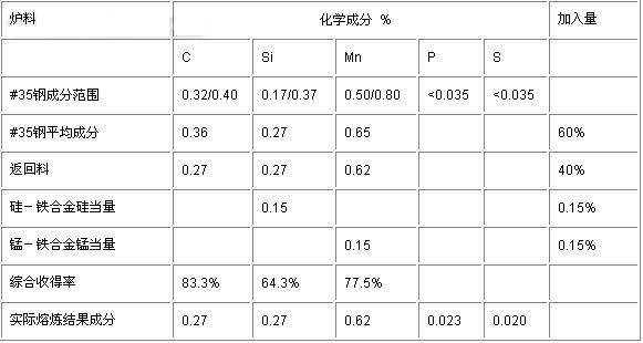 雖然可以通過用氧化法煉鋼來消化價格更低的廢鋼,但實際效果證明并不經濟,因為這樣縮短了爐齡降低了工藝穩定性,延長了熔煉周期,增加了管理成本和用工成本。讓煉鋼工藝條件更優越的的轉爐和電弧爐等去消化廢鋼更有益于社會效益的提高,國外就有冶煉廠專供鑄造單位生產使用的各類合金的中間錠,極為方便了小型鑄造單位的生產,我國沒有這方面的商業渠道,但也不是無路可尋,通過努力我們造到了一些方法。比如,利用煉鋼廠出產的8寸#35鋼錠連冒口重330公斤左右,對標稱500公斤的中頻感應電爐熔煉ZG230-450極為適宜,(表3)為ZG230-450的配料工藝。