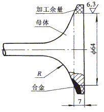 190系列柴油機的氣閥工作環境惡劣,其母體材料分別為:進氣閥,4Cr9Si2;排氣閥,4Cr14Ni14W2Mo。這兩種材料經熱處理后本身硬度就比較高,達到了48~52HRC。為提高氣閥密封線的耐高溫、耐腐蝕、耐磨損、抗沖擊的能力,分別采用進氣閥堆焊鈷基合金,排氣閥堆焊鉻基合金(如圖1所示)。此類合金強度及硬度都較高,機械加工性極差。采用YG3硬質合金刀具加工鉻基合金時,刀具損壞嚴重;而對鈷基合金則根本無法加工。