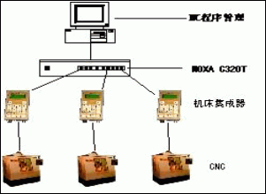這種連接方式是九十年代中期出現(xiàn)的模式,在當(dāng)時(shí)大家還普遍使用單機(jī)傳輸?shù)哪甏朔绞绞且环N創(chuàng)新,可以說它代表了當(dāng)時(shí)我國DNC產(chǎn)品的最高水平。MOXA C320Turbo 卡(或其它多路串行通訊卡)是通過ISA(或PCI)插卡的方式與計(jì)算機(jī)連接,再通過一根帶屏蔽的10芯電纜線接通訊模塊,每個(gè)通訊模塊帶8個(gè)通訊口,可以多個(gè)通訊模塊級(jí)聯(lián),最多可以8個(gè),每個(gè)計(jì)算機(jī)又可以擴(kuò)展4個(gè)ISA(或PCI)插卡,這樣一臺(tái)計(jì)算機(jī)最多可以擴(kuò)展256個(gè)RS-232口。通訊模塊與計(jì)算機(jī)之間距離不能太長,一般在十幾米左右。程序的上傳和下載是通過操作機(jī)床操作盒來實(shí)現(xiàn)的(當(dāng)然,數(shù)控端也還要進(jìn)行相關(guān)的上傳下載操作)。