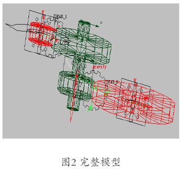 在A D A M S / V i e w 驅動庫中選擇旋轉驅動(Rotational Joint Motion)按鈕,在Speed一欄中輸入3000,表示旋轉速度3000度/秒。左鍵選小齒輪軸JOINT_1作為驅動。完成后模型如圖2所示.