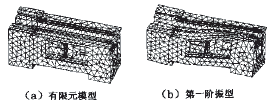 - 床身采用體單元建模(圖1a)。第一階振動頻率為289.5Hz,為相對位移量較大的扭轉振動(圖1b)。這反映出原床身在磨削力激勵下容易產生大幅扭振,使磨削表面產生振紋,導致磨削精度的下降。