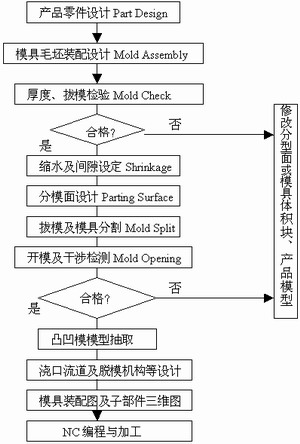 利用Pro/ENGINEER進行模具設(shè)計的流程如圖1所示。首先將設(shè)計好的產(chǎn)品零件和依標(biāo)準(zhǔn)模架設(shè)計的模具毛坯零件進行裝配,設(shè)置好正確的拔模方向,進行拔模和厚度檢測,設(shè)定產(chǎn)品收縮率與凸凹模間隙;然后,進行模具分型面的設(shè)計與凸凹模的分割,再進行開模模擬和干涉檢測;待凸凹模抽取成功后進行澆口流道及脫模機構(gòu)、標(biāo)準(zhǔn)模架及組件的裝配設(shè)計;最后,將所有的設(shè)計成品轉(zhuǎn)入生產(chǎn)部門進行零部件的選取與加工制造。由此可知,它將企業(yè)的產(chǎn)品設(shè)計、工藝設(shè)計、模具設(shè)計和數(shù)控加工編程集成在一起,提高了產(chǎn)品、模具、工藝設(shè)計及數(shù)控編程的效率。#p#分頁標(biāo)題#e#