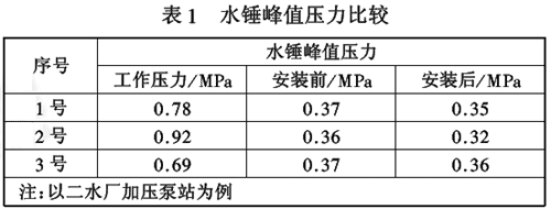 由表1 可見,增壓泵在加壓泵房的使用中可以完全消除水錘。綜上所述,增壓泵在加壓泵房的應用,可以節省安裝空間,降低損耗,并有效徹底地消除水錘,降低事故發生率,且經濟可行,使供水企業的心臟安全可靠地跳動,大同市自來水公司使用該閥一年多,運行良好,值得在廣大供水行業中推廣運用。
