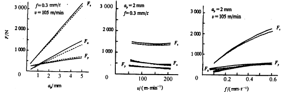 - 試驗在大連機(jī)床廠生產(chǎn)的C620-3型普通車床上進(jìn)行,外圓干式切削,工件材料為45鋼,退火狀態(tài)。根據(jù)主偏角的要求,選擇可轉(zhuǎn)位車刀刀桿符合GB5343.2-85標(biāo)準(zhǔn)。切削力的測量選用瑞士產(chǎn)的新型Kistler壓電式測力儀(型號為9257B)以及配套的電荷放大器,SC16光線示波器記錄儀。對試驗用三種斷屑槽形,分別改變切削深度ap,切削速度v,進(jìn)給量f,用接觸圖形法測量切削區(qū)的刀-屑接觸長度,對切削力進(jìn)行測量,試驗結(jié)果如圖2所示。