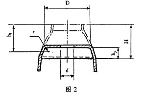 經多次試驗分析,設引伸高度hy=18,凸模圓角r=16,翻邊孔底部中徑D=59,翻邊后需達到圖 紙要求總高度H=35(見圖2)。