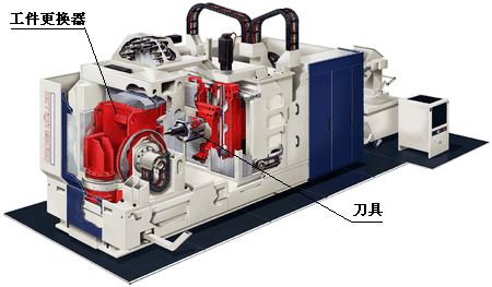 高速干切削對機(jī)床的基本要求,首先必須是高速機(jī)床,要有較高的切削速度和進(jìn)給速度,同時結(jié)構(gòu)上要有利于快速排屑,并有較高的熱穩(wěn)定性。內(nèi)置的高速電機(jī)主軸是機(jī)床實現(xiàn)主軸高速運轉(zhuǎn)的最佳選擇,目前可選的高速主軸轉(zhuǎn)速從10,000r/min到150,000r/min ,功率從0.5kW到80kW,可以滿足不同的切削需要;快速進(jìn)給系統(tǒng)可以采用改進(jìn)的滾珠絲杠或直線電機(jī),進(jìn)給速度可以達(dá)到60~180m/m/min,加速度可達(dá)19.6~98m/s2,完全滿足快速進(jìn)給的需要。因此,在高速機(jī)床日益普及的今天,高速干切削對機(jī)床的要求主要針對機(jī)床的整體結(jié)構(gòu)和輔助設(shè)施,機(jī)床床身是保證機(jī)床穩(wěn)定性的基礎(chǔ)大件,應(yīng)采用熱穩(wěn)定性較好的整體鑄造的框架式或龍門式結(jié)構(gòu),最好應(yīng)用絕熱材料“人造花崗巖”或新型均熱材料(如在鋁材料中添加20%的碳化硅得到的新型復(fù)合材料),增加絕熱傾斜蓋板。機(jī)床整體結(jié)構(gòu)盡量簡單,盡可能采用方便排屑的立式主軸布置,工作間寬敞明亮,內(nèi)部減少凸臺、凹槽,方便排屑,密閉工作間內(nèi)增加通風(fēng)設(shè)施。如圖1是MURATEC公司的MW系列雙塔干式車床模型,其主體結(jié)構(gòu)對稱,排屑簡單方便,采用雙主軸平行布置,帶有12刀位轉(zhuǎn)塔,有很高的加工效率,適合于鑄件、淬硬鋼。圖2所示的加工中心是Hueller Hille公司專門為干切削設(shè)計的specht 500T型高速加工中心,這種加工中心最大的特點就是有一個可沿水平軸轉(zhuǎn)動的工件更換器,利用這種工件更換器,工件在裝料側(cè)處于正常位置,而在工作間里則是自上而下懸掛著進(jìn)行切削,使切屑可以從上面自然落下。其主軸轉(zhuǎn)速高達(dá)25,000~60,000r/min,主電機(jī)功率60kW, 帶有液氮冷卻系統(tǒng),結(jié)構(gòu)簡單,排屑可靠,很適于對鋁合金或纖維增強(qiáng)塑料等進(jìn)行高速干切削。