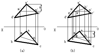 作法: 1 )從 a' 向下量取 15mm ,作一平行于 OX 軸的直線,與 a'b' 交于 m' ,與 a'c' 交于 n';