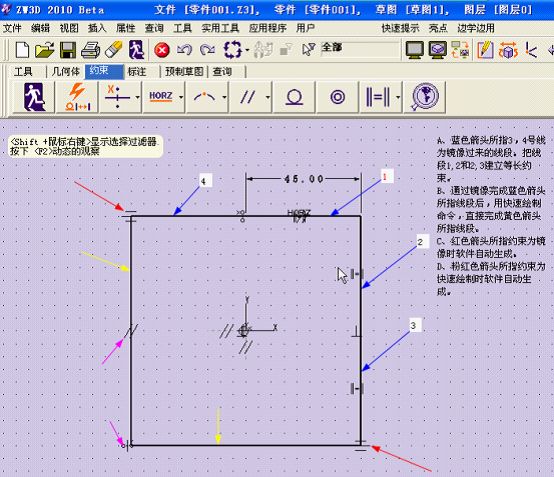 正四邊形有一個幾何中心,在設計過程中,有時候可能需要在不改變其幾何中心的情況下,調整其邊長。那么,我們可以通過中望3D草繪模塊所提供的幾何約束和尺寸約束功能,非常方便的來實現一個效果——通過一個尺寸,改變正四邊形大小,同時保持幾何中心不變。具體操作步驟如下: